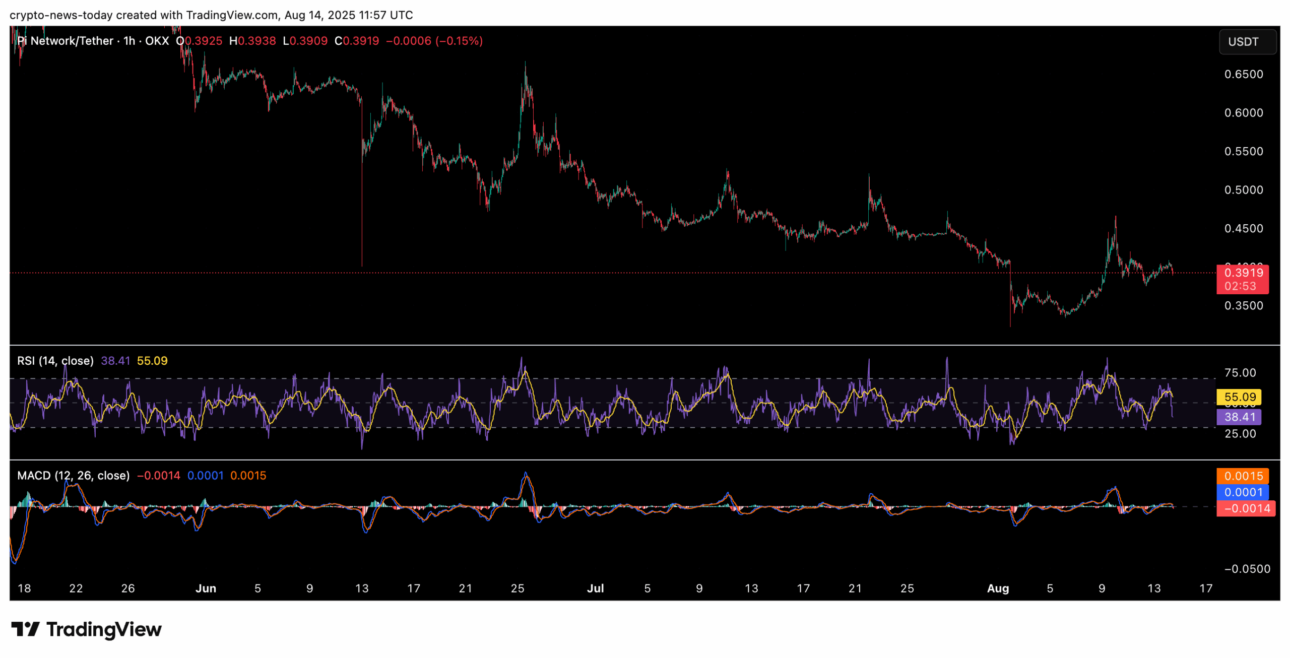 At the time of writing, Pi trades at $0.3915, up 8.31% in the past week but down 2.17% in market cap over the last day. Technical charts show the price consolidating after a period of volatility, with the RSI hovering between neutral and oversold zones – suggesting a potential move in either direction.