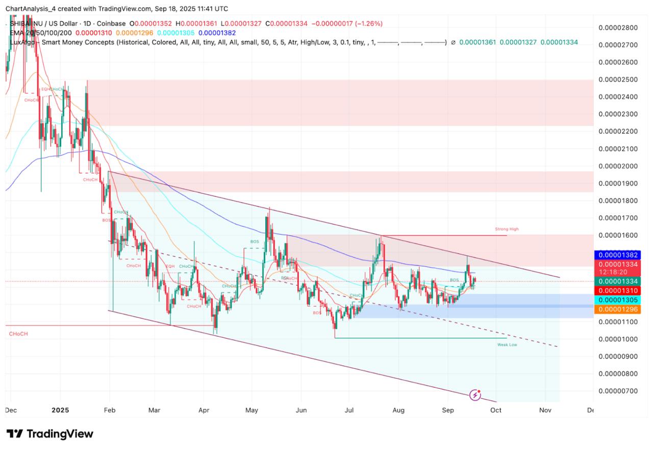 Shiba Inu news is heating up as the meme coin trades within a descending triangle, squeezed between $0.00001310 support and $0.00001380 resistance. Buyers keep testing the upper limit, but it’s been a stubborn wall. Still, the Shiba Inu price sits near the 20- and 50-day EMAs, hinting at a solid base that traders are closely watching.
