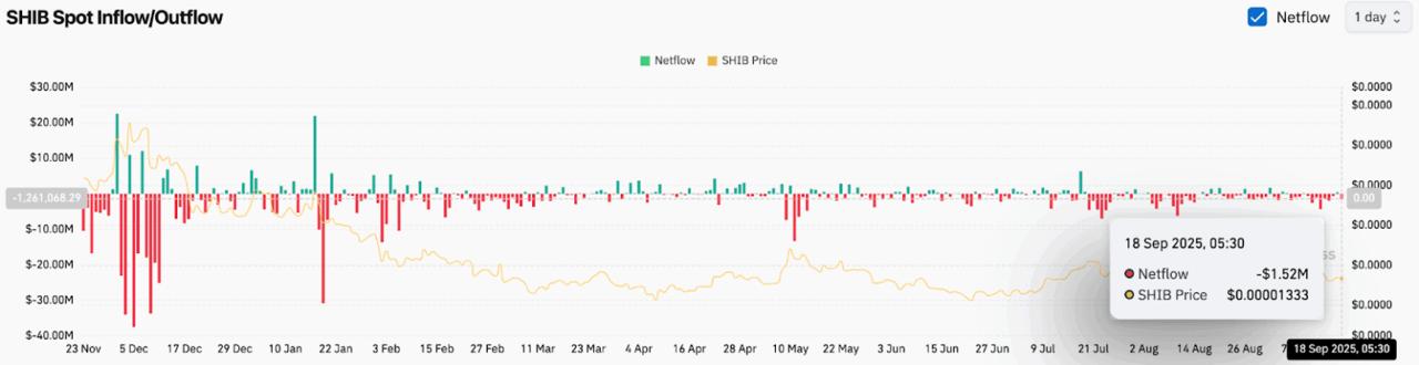 On-chain Shiba Inu data adds more intrigue. Around 60 billion SHIB tokens flowed into exchanges in September, sparking talk of whale activity. Yet since January 2025, the token has shown steady outflows—a sign that accumulation may still be happening behind the scenes, despite recent short-term selling pressure.