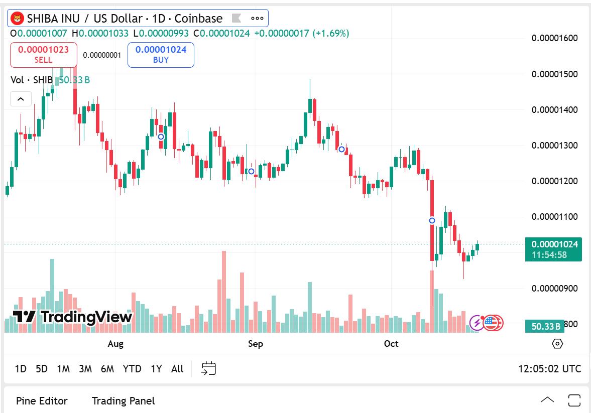 The Shiba Inu Price is trading at $0.00001023, marking a 1.77% daily gain and a market cap of $6.02 billion. Daily trading volume stands at $143.53 million, up 2.14% as investors begin to re-enter the market. The renewed burn initiatives have cut SHIB’s circulating supply, slowly boosting confidence in its long-term potential.