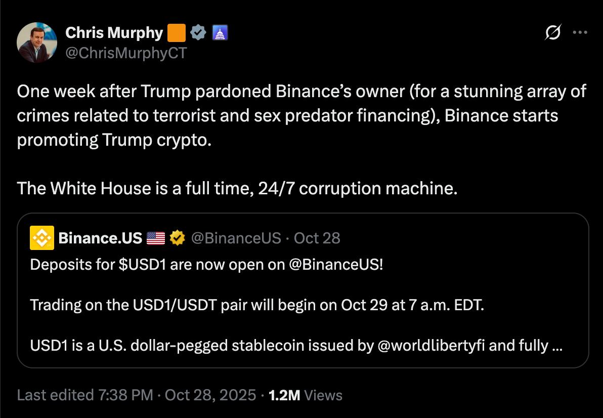 In a post on X, Murphy accused the exchange of “promoting Trump crypto” shortly after the controversial pardon, calling the timing suspicious. CZ, who had previously pleaded guilty to violating US anti-money laundering laws, received a presidential pardon on October 23. This has sparked ethics concerns across Washington.