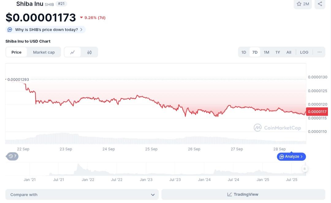 The Shiba Inu price prediction is down as a result, about 9.39% on the seven-day charts.