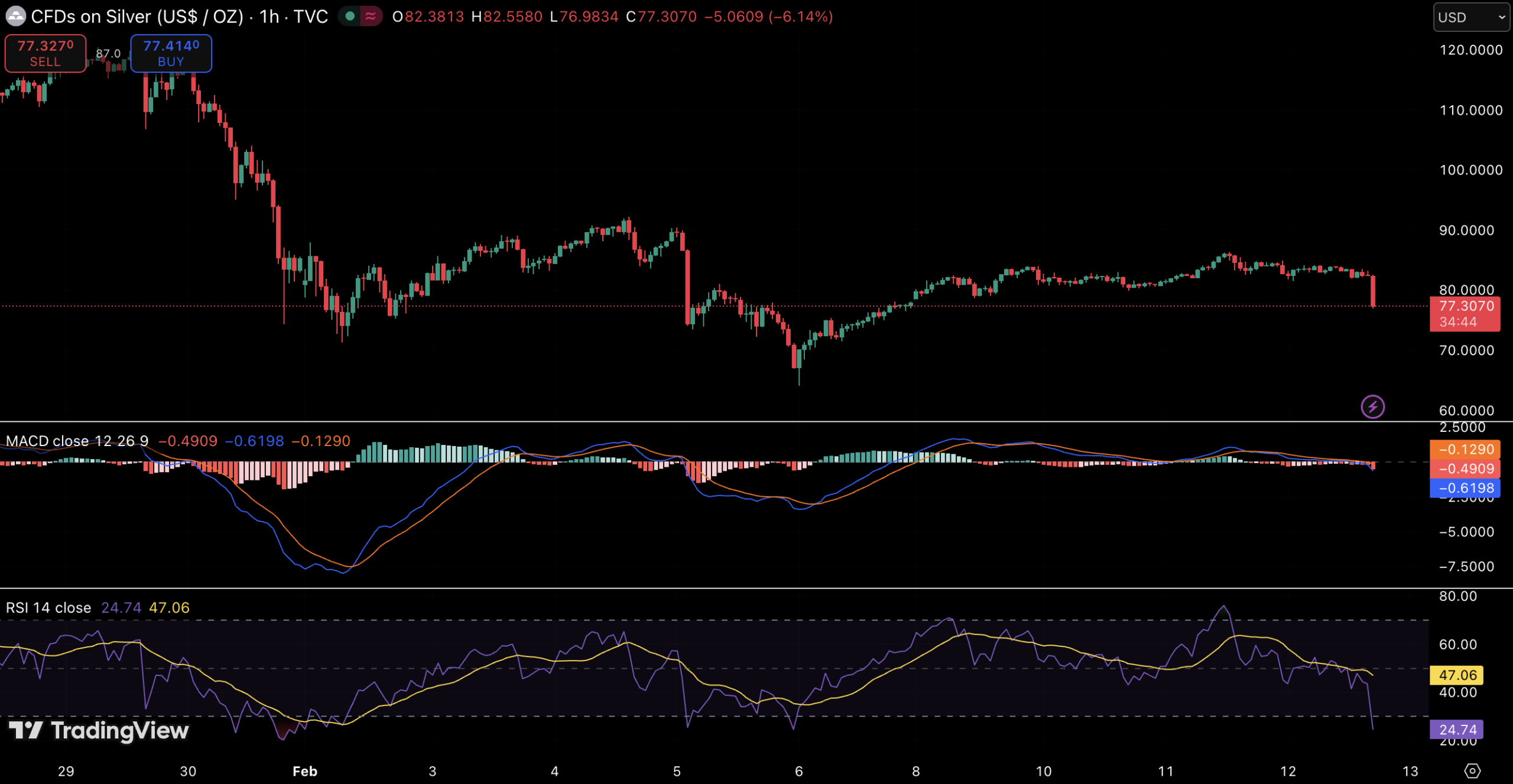 After reaching an all-time high of $121.58 on January 29, the market experienced a violent reversal the following day, plunging toward the high-$70s in what many traders described as a “flash crash.” Prices later stabilized near $68 in early February before staging a brief recovery toward $84. That rebound has now faded, with silver trading around $77 and back under the psychologically important $80 threshold.