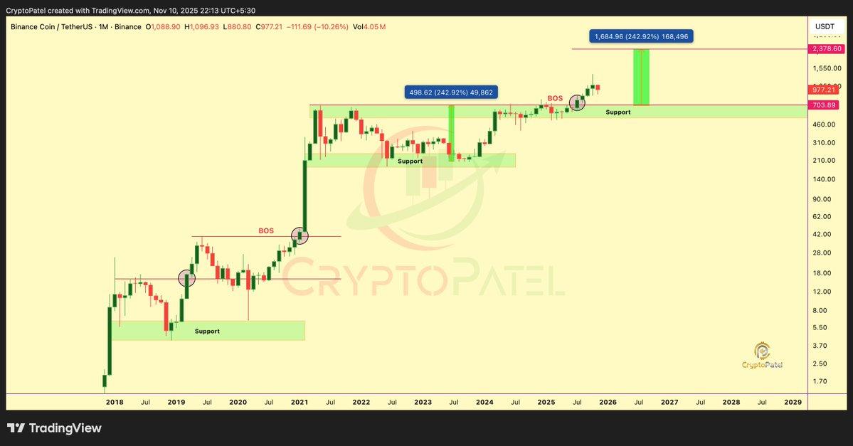 Analysts split scenarios for the next two years. CryptoPatel sketches a roadmap that sends BNB toward $1,125 if bulls defend the $970–$980 region, with a stretch extension toward $2,300 if broader liquidity improves. Crypto GEMS highlights $839 as a key downside level, while Crypto Tony points to $973 as a breakout trigger.