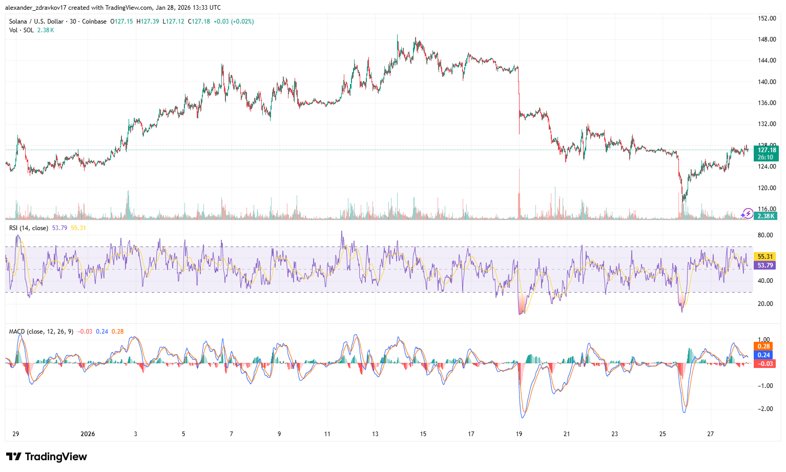 At the time of the expansion, Solana is trading around $127, following a period of heightened volatility earlier in the month. After peaking near the mid-$140s, the asset experienced a sharp drawdown toward the low-$120s before stabilizing and attempting to recover. This consolidation phase suggests the market is absorbing recent selling pressure while evaluating new catalysts, including increased institutional activity tied to real-world asset tokenization.