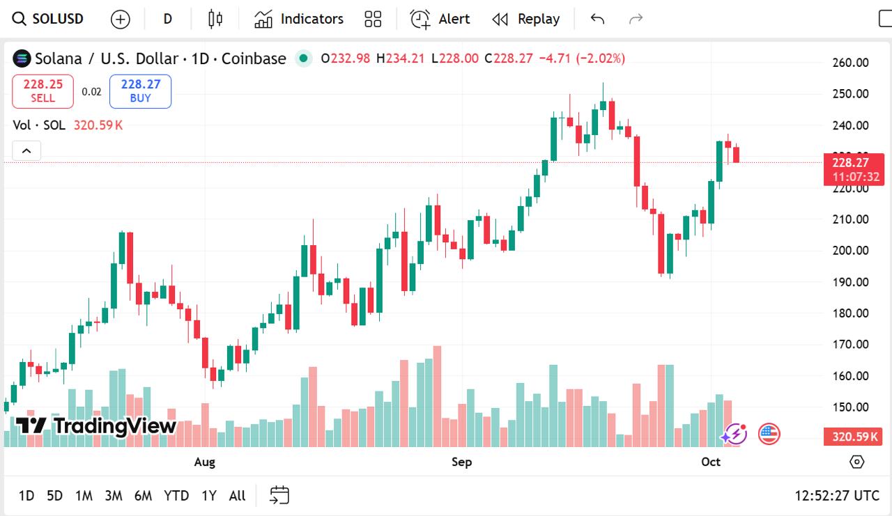 Solana is currently trading at $228.25 and has depreciated 1.02% in the past day. Its market capitalization stands at $124.75 billion, supported by a $8.2 billion trading volume that has reduced by 10.17%. The figures place Solana among the best-performing blockchain networks, marked by high liquidity and strong institutional appetite.