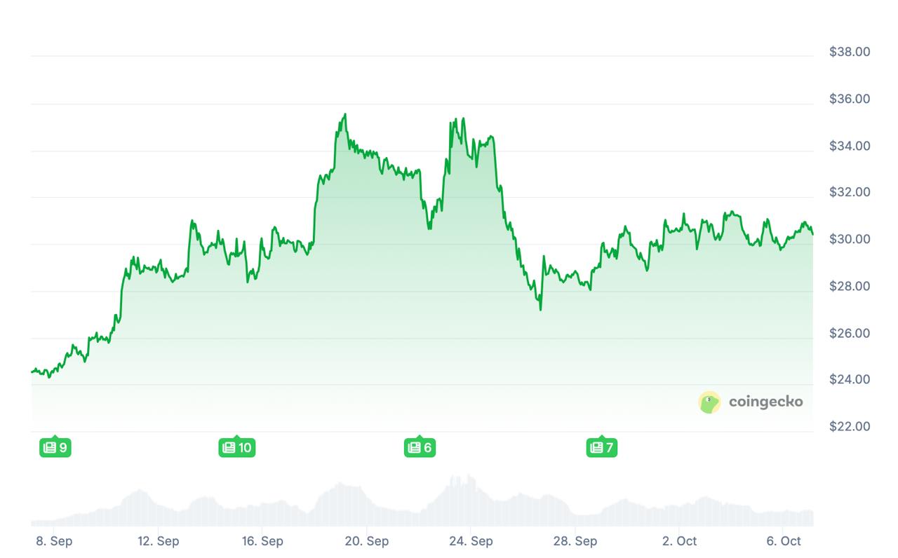 AVAX isn’t waiting for permission to rally, trading at $31 after a 25% surge this past month. With that, it’s reclaiming its position as a serious Layer-1 contender. The subnet adoption continues accelerating, with gaming and DeFi projects choosing Avalanche for its customization options and low fees.