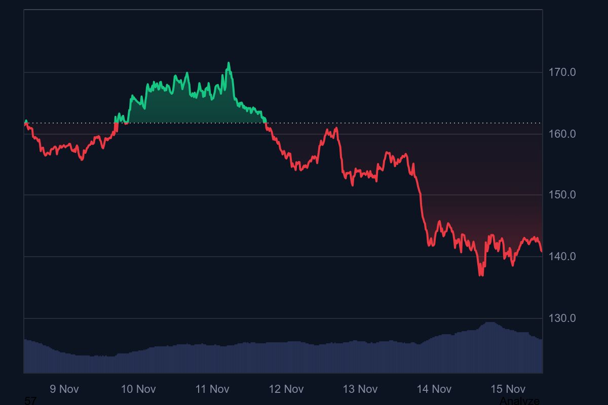 Since November 4, $SOL’s price action has been relatively smooth, maintaining steady price levels between $150 and $160, untill 11 of November when the price started its freefall. In the past 24 hours, Solana’s price has dropped to $140, representing a solid 12% loss for the week, as of writing.
