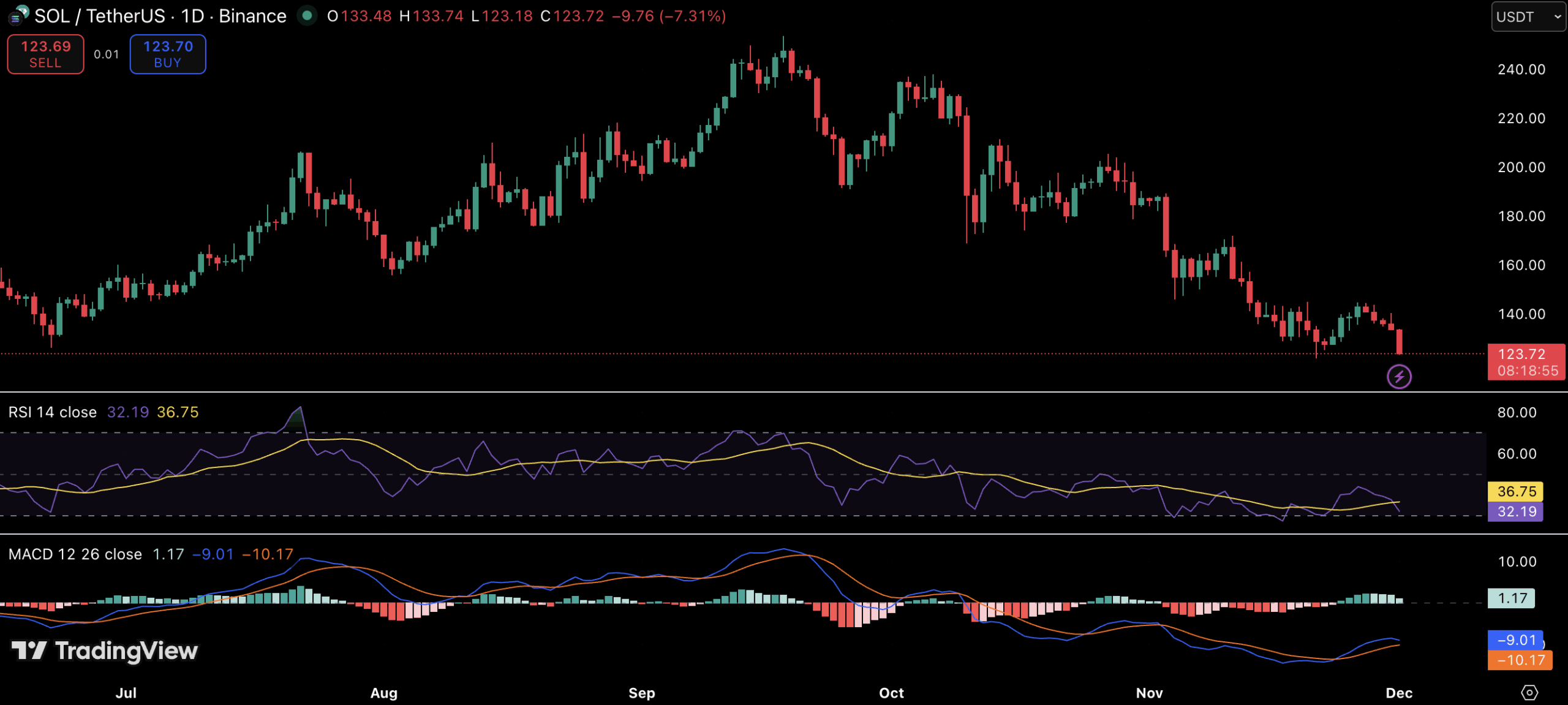 After dropping more than 10% in the last 24 hours to roughly $123, SOL is hovering near a key support level where buyers previously defended the trend. Technical signals now point to a critical make-or-break zone that could dictate the next major move.