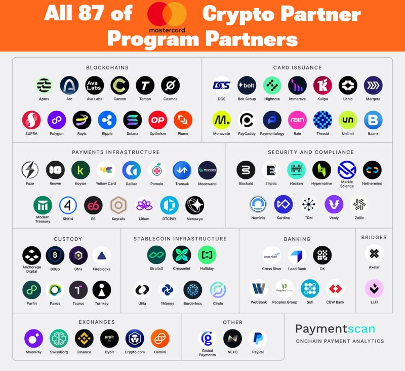 While the policy debate played out in Washington, the corporate infrastructure was being assembled quietly elsewhere. Mastercard’s Crypto Partner Program – now at 87 companies – isn’t a marketing initiative. It reads more like a financial system rebuild.