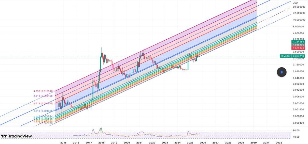 Stellar is currently trading around $0.383, supported by a rising TVL of $144 million and strong investor confidence. Analysts like Mikybull Crypto highlight that Stellar’s recent breakout above a descending wedge marks the beginning of a possible long-term uptrend.