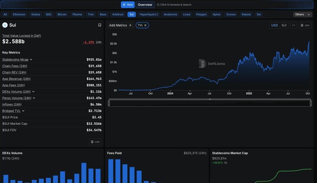 SUI currently trades near $3.45, and data shows its TVL climbing to $2.58 billion. Technically, SUI has spent almost a year within a symmetrical triangle, setting up for a potential price increase to $7.34 and $10.86.