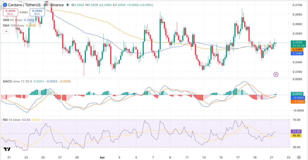 Technical Picture (4H): ADA is trading around $0.2504, clustered tightly with SMA 50 ($0.2486) and SMA 100 ($0.2489) – all three compressed together, which typically precedes a directional move. RSI at 52.92 is neutral. The MACD line (0.0003) has crossed above the signal line (-0.0003) but the histogram remains near zero. A confirmed move above $0.255 would open room toward $0.27.