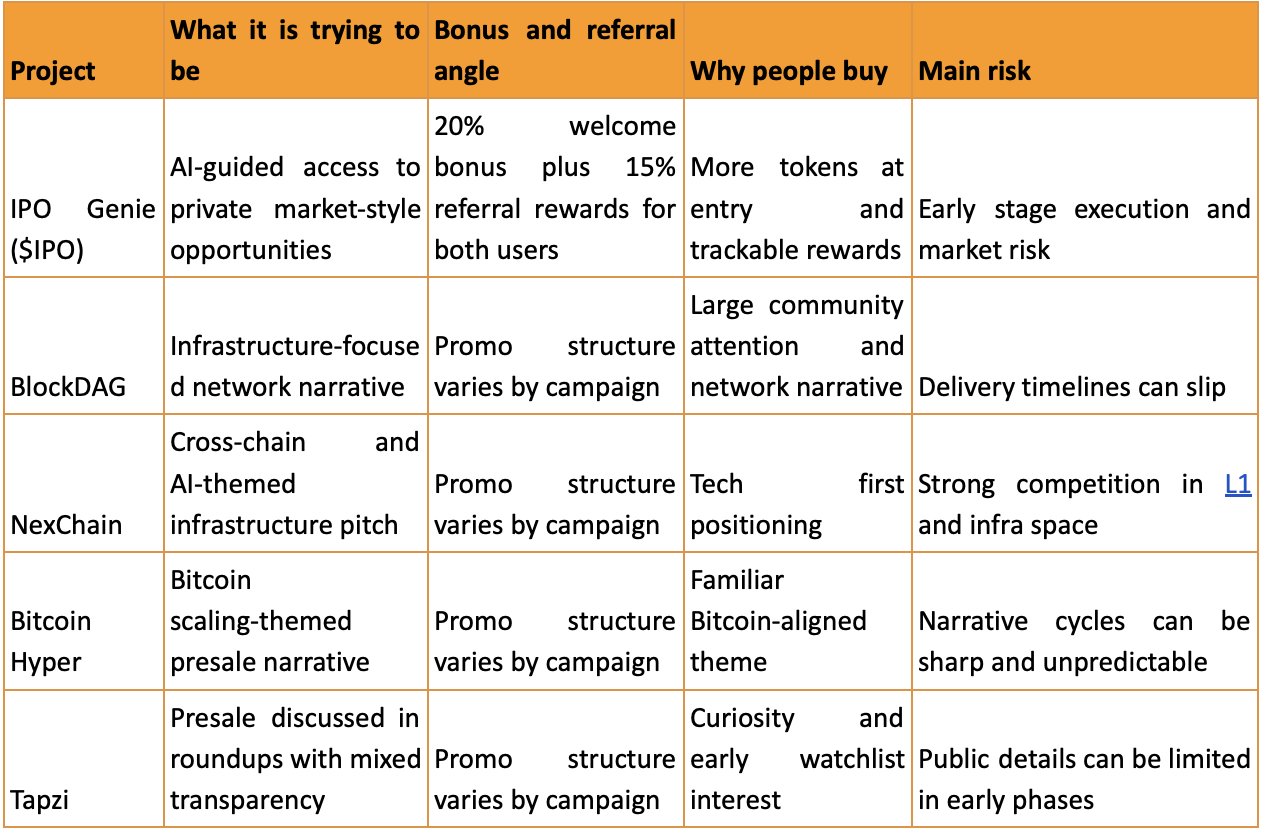 This comparison is written for that intent. It reviews several popular categories fairly, then explains why IPO Genie ($IPO) keeps showing up in Top crypto presales as a crypto presale with bonus rewards that are easy to understand and easy to measure. This article uses simple examples and publicly stated program rules, while noting that presales remain high risk.