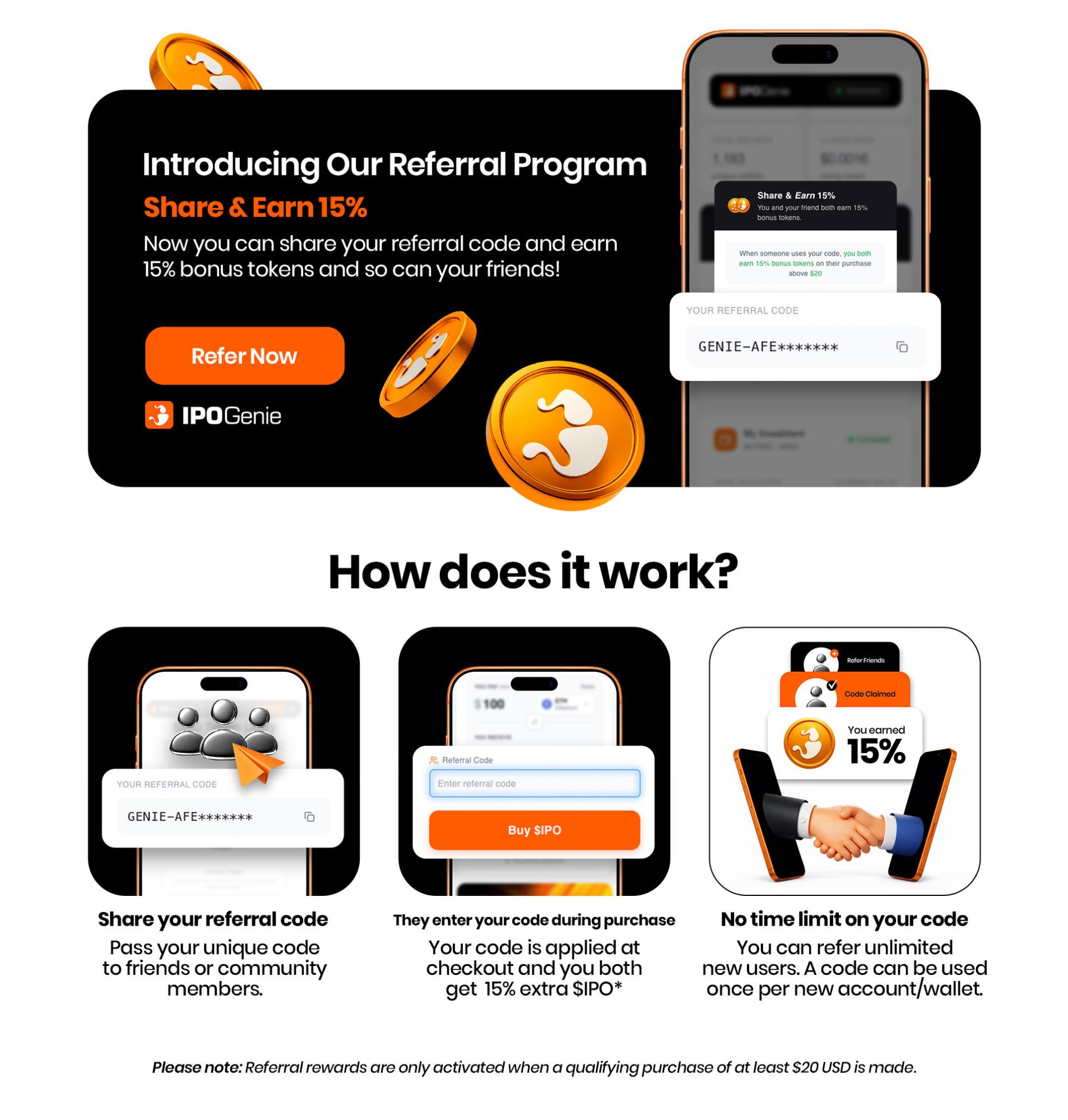 - Once payment is successful, both users receive 15% extra $IPO credited to the IPO Genie wallet.