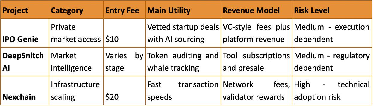 Each project tackles a different problem for different users. IPO Genie serves investors wanting deal access. DeepSnitch AI helps traders avoid scams. Nexchain builds for developers needing better infrastructure.