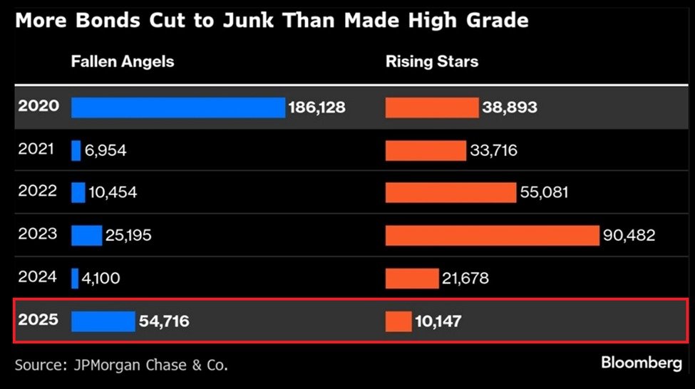 In 2025, roughly $55 billion worth of US corporate bonds were downgraded from investment-grade to junk status, marking the highest annual total since 2020. At the same time, upgrades back into investment-grade territory fell to just $10 billion, the weakest showing in at least six years. The imbalance underscores a market increasingly tilted toward credit stress rather than recovery.