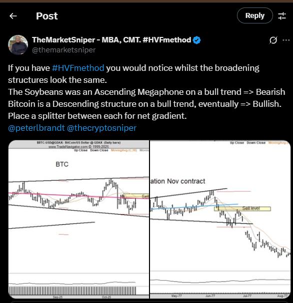 One major pattern specialist, Francis Hunt, notes that the direction of the megaphone differs. He says the Soybean’s pattern was an Ascending megaphone, while Bitcoin’s is a Descending structure. Unlike Brandt, he believes BTC’s pattern is bullish.