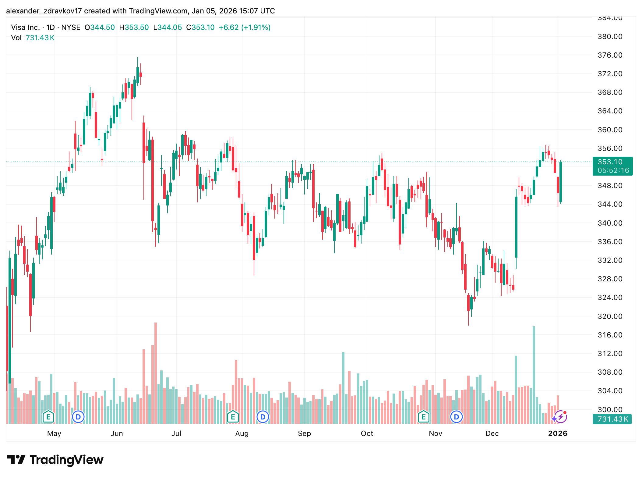 Visa’s stock has been showing renewed strength as investor confidence builds around the company’s expanding role in digital payments. Shares recently climbed to around $352, posting a solid daily gain of nearly 1.8%, with trading activity picking up alongside the move. The rebound follows a volatile second half of 2025 and suggests the market is responding positively to Visa’s accelerating crypto card adoption and stablecoin strategy. As digital asset payments move from niche to mainstream, investors appear to be pricing in Visa’s ability to capture long-term growth at the intersection of traditional finance and blockchain infrastructure.