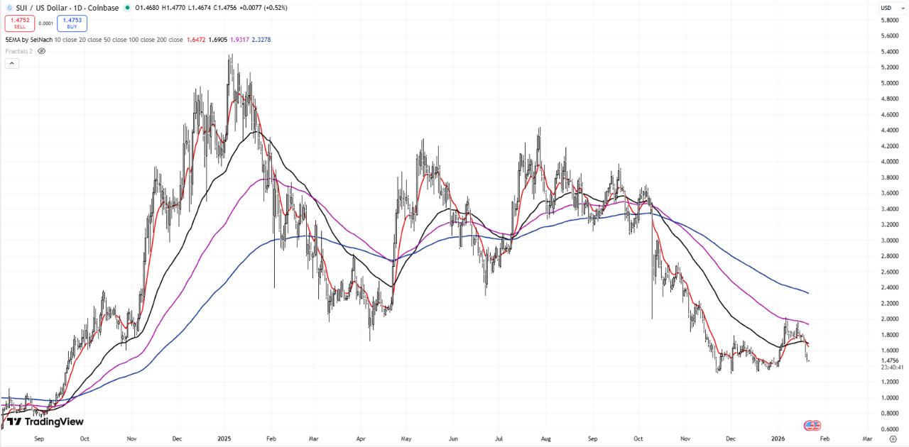Sui is a high-performance Layer 1 designed for fast transactions and consumer-scale applications. It’s part of the ‘new’ generation of layer 1s. But the market isn’t the same beast as 2021, and the chart tells the whole story. Since early 2025, SUI has been in a prolonged downtrend and is no longer a top altcoin to buy.