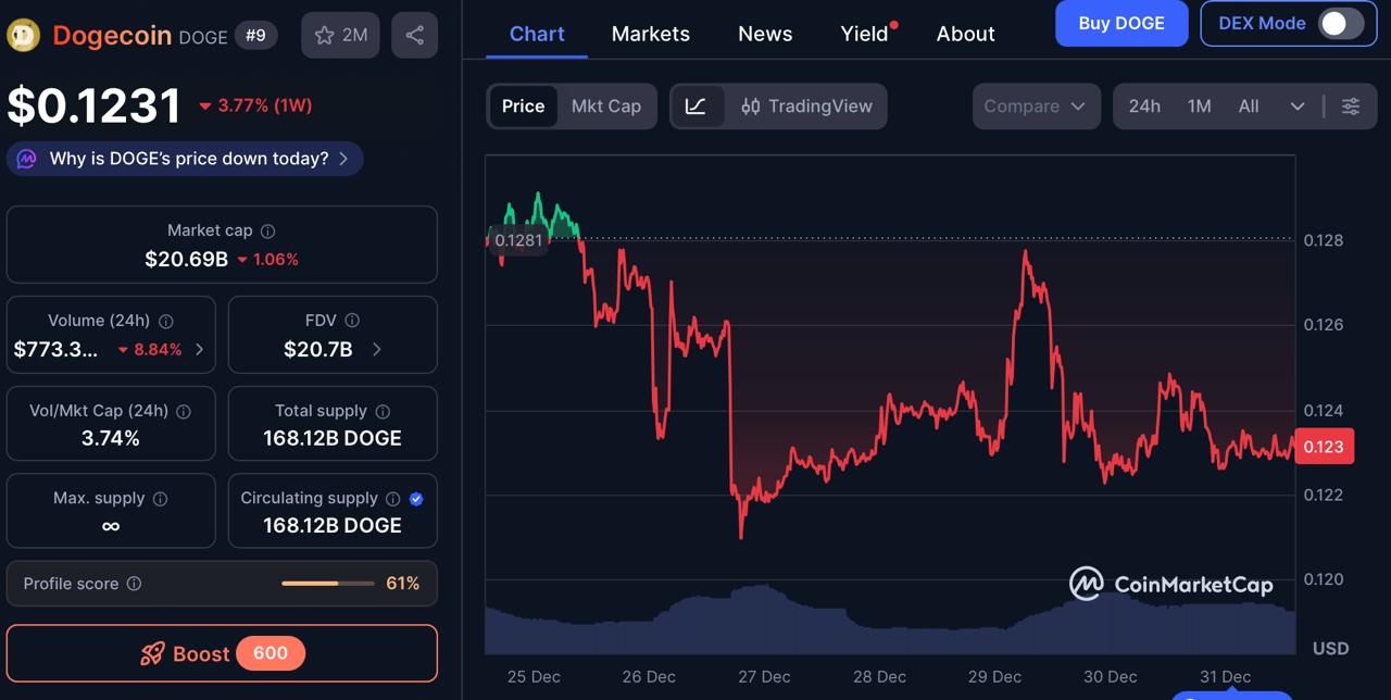 Over the past seven days, Dogecoin has slipped nearly 4%, breaking down from the $0.128 resistance area and drifting into a lower trading range.