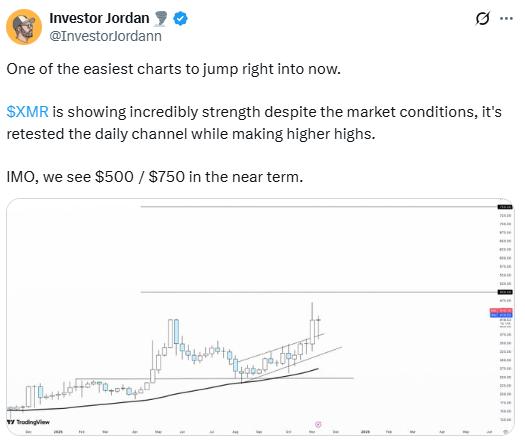 Trading slightly below its 2021 all-time high of $517, the bulls’ next target is a breakout and price discovery. For top analysts like Jordan with over 25,000 followers on X, XMR coin may be the best crypto to buy now. Their forecasts target $500 and $750 in the near term, citing incredible strength despite broader bearish market conditions.