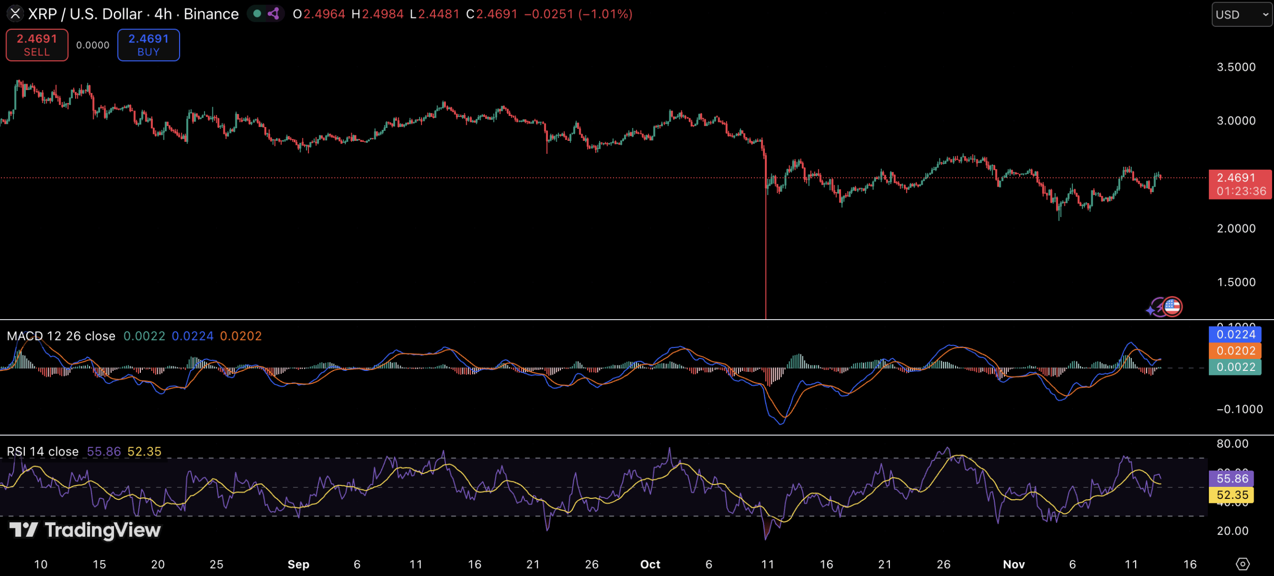 On the cryptocurrency markets, XRP traded around $2.47 during the ETF’s debut. The 4-hour chart shows consolidation following recent volatility, with buyers and sellers attempting to establish direction amid the broader market cooldown.