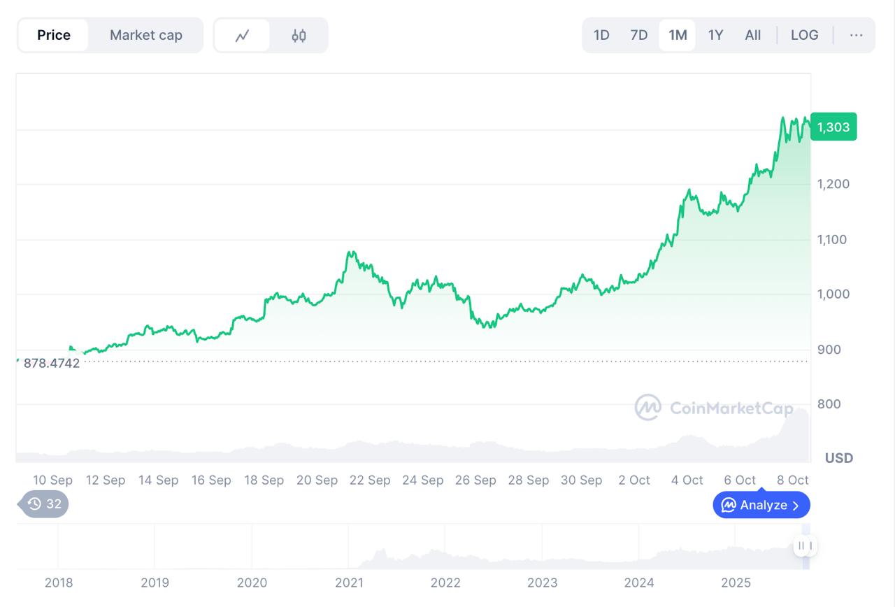 BNB has moved past XRP in market capitalization, reclaiming the fourth spot among the largest cryptocurrencies. On October 8th, BNB’s price reached about $1,305, supported by steady activity across Binance’s ecosystem.
