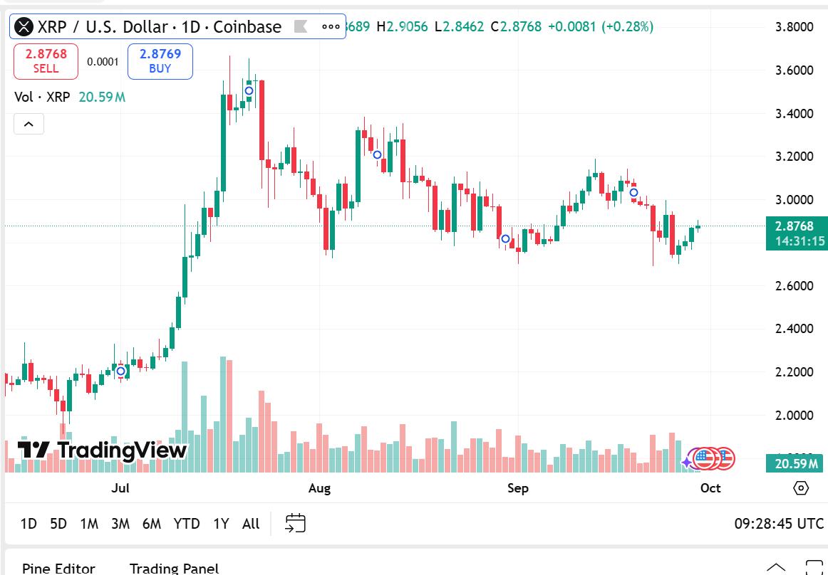 The XRP Price has traded at $2.87, a 3.97% change from yesterday, with a market cap of $173.05 billion and 35.34% higher trading volume of $4 billion. These figures indicate renewed bullishness surrounding Ripple’s network adoption and wider DeFi incorporation.