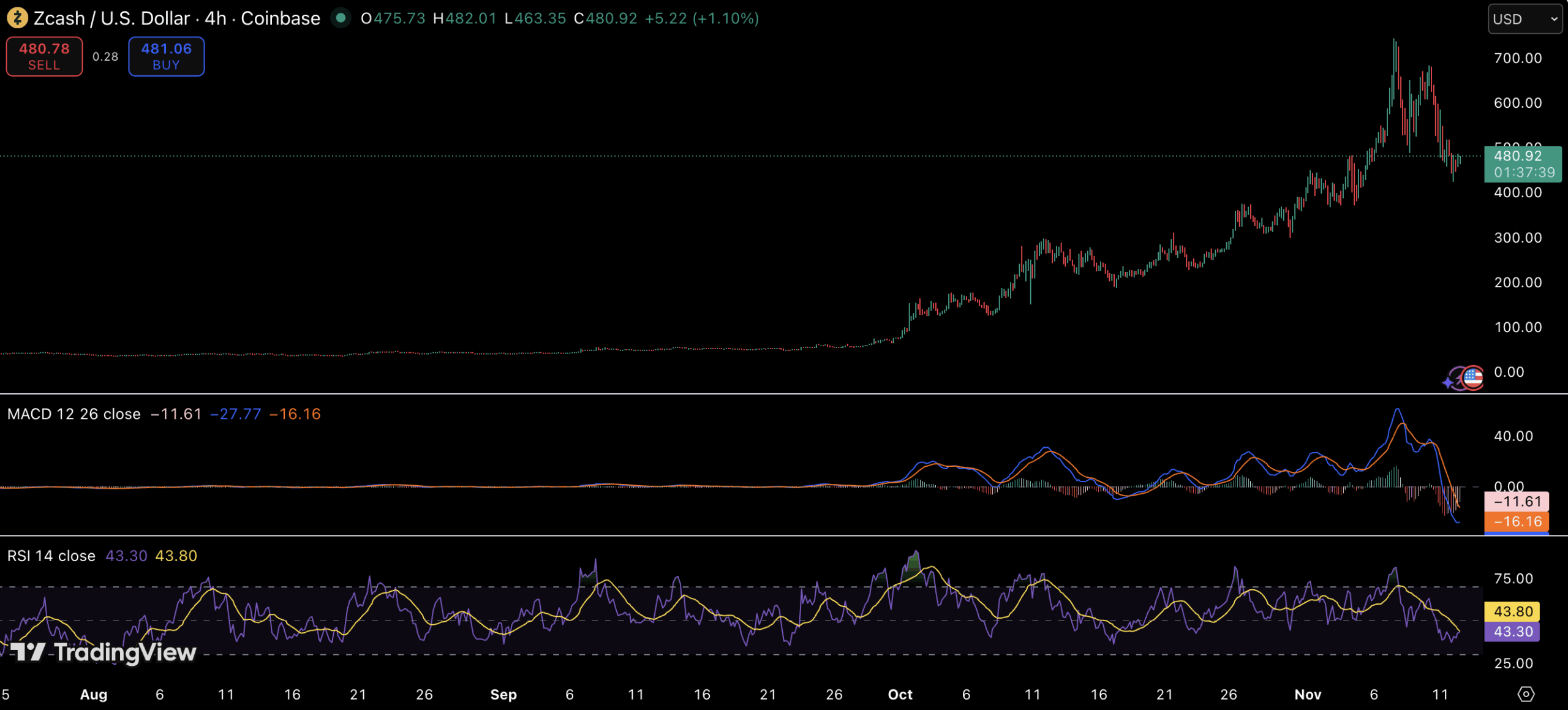 Zcash is currently trading near $480, up about 1.1% in the last session, after recently pulling back from highs above $700 earlier this month. The four-hour chart shows that momentum has cooled following a parabolic rise in October.